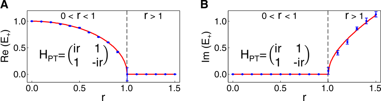 图:实验观测到宇称时间对称性破缺。A、B分别为宇称时间对称哈密顿量HPT本征能量E的实部和虚部。哈密顿量在其参数0的区域,宇称时间对称性未破缺,能量本征值为实数;在r>1的区域,宇称时间对称性破缺,能量本征值为虚数;r=1处为相变点。(图来源于《科学》文章正文)