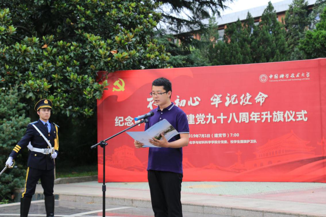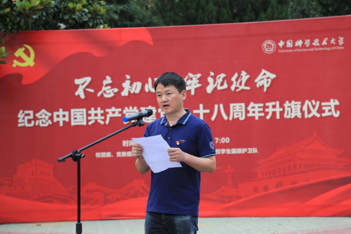学生党员代表、大数据学院焦守坤同学在发言中表达了对中国共产党建党九十八周年生日祝福。他表示作为中国科大的青年学子,要时刻铭记自己的初心与使命,在科研道路上严于律己,努力弘扬科教报国、追求卓越的科大精神。