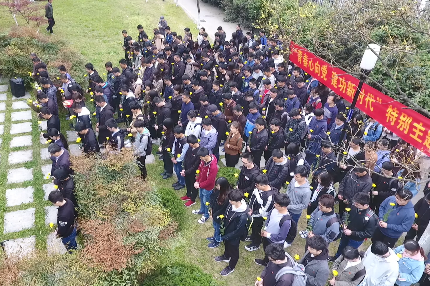 面向塑像,在场师生全体默哀、敬献鲜花,向以郭永怀和杨承宗为代表的老一辈科学家致敬,场面庄严而肃穆。