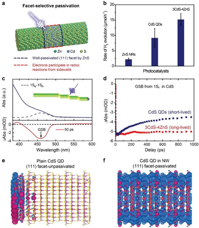 图2.光催化性能与机理研究。a, 晶面选择性钝化效应示意图。b, 不同光催化剂的产氢速率。c, 吸收光谱与瞬态吸收光谱。d, 瞬态吸收衰减谱。e, 纯CdS量子点的电荷分布图。f,量子点-纳米线的电荷分布图。