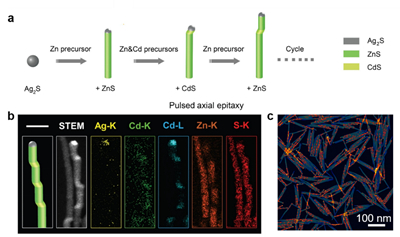 图1.脉冲式轴向外延生长胶体量子点-纳米线分段结构。a, 合成示意图。b, CdS-ZnS量子点-纳米线的元素面分布图。c, CdS-ZnS量子点-纳米线的暗场像图片。