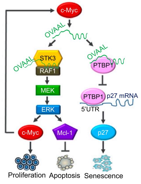 吴缅教授研究组发现,在肿瘤组织中高表达的lncRNA OVAAL在肿瘤细胞产生耐药的过程中发挥了重要功能。一方面,OVAAL与STK3及Raf-1形成三元复合物,以此激活ERK通路,从而促进了c-Myc介导的细胞增殖和Mcl-1介导的抗凋亡的功能。另一方面,OVAAL通过与p27 mRNA竞争性地结合PTBP1,抑制了p27的表达,从而规避了肿瘤细胞的衰老。人为干预使OVAAL表达降低,会使肿瘤细胞对于多种抗肿瘤药物的耐药性降低,小鼠移植瘤的生长被抑制,并且会促进肿瘤细胞衰老。这就提示OVAAL具有促癌效应,有可能成克服癌症耐药性一个潜在靶位。
