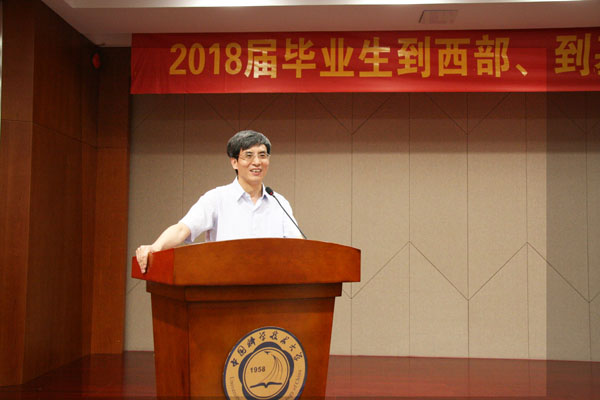 化学与材料科学学院高分子科学与工程系党总支书记何卫东作为老师代表发言,祝贺同学们做出这样崇高的选择,寄语大家在今后的道路上继续发扬科大学生勇攀科学高峰的精神,谦虚勤奋,踏实工作,并注重自身锻炼,全面发展。毕业生代表地球和空间科学学院博士生胡晓临发言表示,将与在座的各位毕业生一起,追随老一辈科大人的脚步,加入英雄的队伍,奔赴国防建设一线,从事伟大的事业,不辜负祖国和人民的期望,不辜负科大的培养。