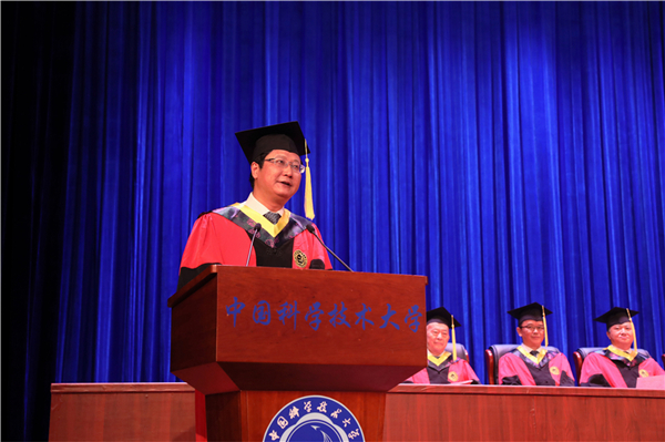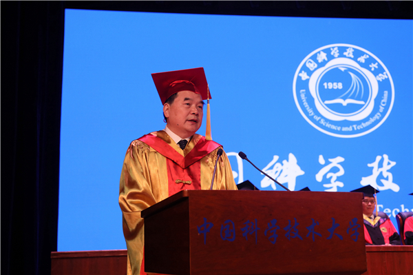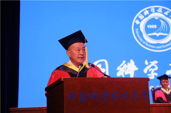 在热烈的掌声中,校学位委员会主任、校长包信和院士致辞,深情寄语即将毕业的同学们。他首先代表学校全体教职员工衷心祝贺同学们顺利完成学业、获得学士学位,并向毕业生的老师和亲友表示感谢。