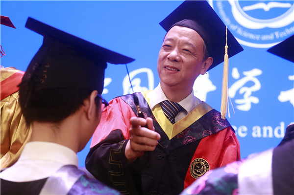 包信和说,四年来,同学们在教学相长、对话大师的过程中醉心于思想碰撞,在严格的学术训练和理实交融的创新实践中浸润科学精神,在丰富多彩的社团活动中释放青春激情,在服务社会的实践中增长才干。在中国科大的熔炉里锻造,深深地打上了中国科大的烙印,成为了名副其实的科大人,我为大家感到骄傲!