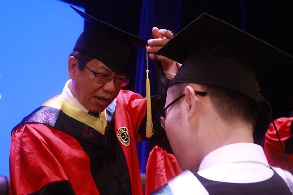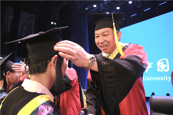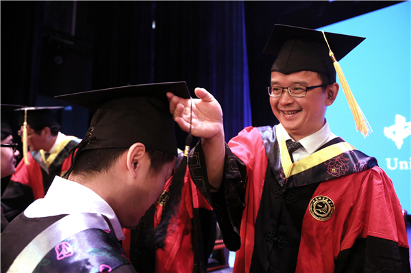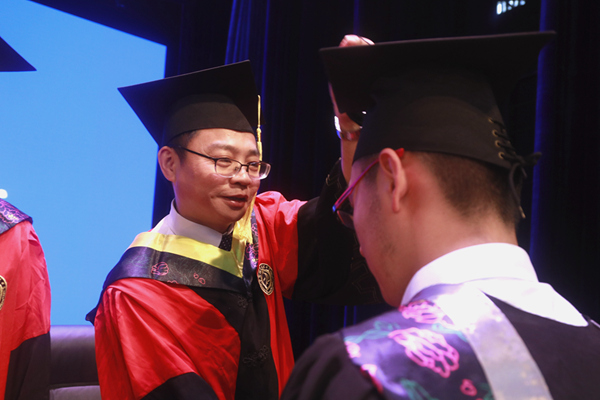随后,毕业生依次登上主席台,校领导和导师们为他们一一扶正流苏。