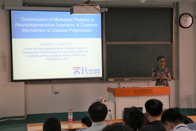 首先,Lee教授做了题为“Transmission of Misfolded Proteins in Neurodegenerative Disorders: A Common Mechanism of Disease Progression(错误折叠的病理蛋白在神经退行性疾病中的传播:疾病进展的共同机制)”的报告。蛋白质聚集常见于多种神经退行性疾病,而特定的疾病病理的传播是与年龄相关的神经变性疾病的共同病理机制,其中,Tau蛋白的病理改变常见于阿尔茨海默病、脊髓侧索硬化症、帕金森综合征等多种神经退行性疾病。Lee教授研究主要关注了α-突触核蛋白及TDP-43的病理改变在疾病发生中的作用,并提出两种假说:1. 传播假说:错误折叠的神经变性疾病蛋白是否可以启动并诱导小鼠模型中病理的细胞-细胞传播?2. Strain(病理蛋白亚型)假说:神经变性疾病中不同疾病的病理蛋白亚型的特点(strain)是否可以解释临床疾病的多样性? 通过大量的体内外实验,得出以下结论:AD-Tau可以诱导非转基因鼠形成Tau病理,α-突触核蛋白及TDP-43也有相同效果,并且从tau蛋白病的人脑中提取的病理性tau亚型在动物体内具有不同的传播模式。