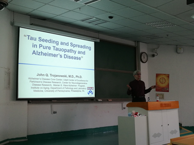 随后,Trojanowski教授作了题为“Tau Seeding and Spreading in Pure Tauopathies and Alzheimer’s Disease(Tau在纯Tau蛋白病和阿尔茨海默病中的播种和传播)”的报告。由于阿尔茨海默病中多种病理蛋白质共存的复杂性, 和相关的Tau蛋白病变及其他疾病对发病机制的理解和药物开发是一种挑战, 这可能需要联合疗法来治疗这类复杂的疾病。Trojanowski教授介绍了不同的Tau的病理亚型发现于不同的神经退行性疾病中,而Tau作为AD发病机制的研究和药物开发的靶向病理蛋白,它和其他病Tau病变的病理性Tau明显不同于正常Tau蛋白,是药物开发的关键所在。此外,Trojanowski教授还展示了大量Tau病理在含有Aβ斑块脑中传播的实验结果。