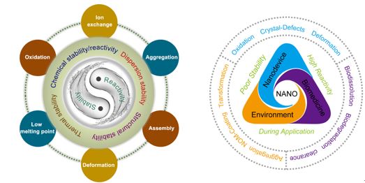 在该评述论文中,在基本概念部分,主要介绍了“悬键”和表面化学微环境这两个概念,并阐述了“悬键”和表面化学微环境与纳米材料稳定性和反应性之间的关联性;从四个方面具体讨论纳米颗粒的稳定性和反应性:分散稳定性、热稳定性、结构稳定性、化学稳定性与反应性;在有关纳米材料的实际应用方面,作者主要从纳米器件、生物医药和环境的角度讨论纳米材料在不同应用条件下的稳定性和反应性。最后,提出了有关纳米材料稳定性和反应性研究的建议,指出原位的定量表征将有利于更深入和清晰地理解纳米材料的变化过程,将有助于客观和定量地评估纳米材料的稳定性和反应性;在实际应用过程中,纳米材料的稳定性和反应性不仅与其自身密切相关,也强烈依赖其它影响因素,例如纳米材料整体的组织结构、用于分散和负载纳米材料的物质以及使用过程中的气氛、温度、湿度等。