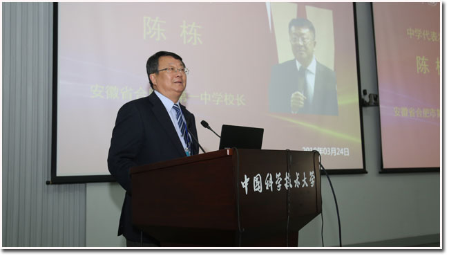中学校长代表、合肥市第一中学校长陈栋在致辞中对全体获奖学生表示祝贺。他说,中国科大在合肥一中的老师和学生心目中,一直是一个求学圣地,科大的办学思想和招生规模十分难得,希望科大学子在今后的科学探索中,充分发挥创新精神,助力中国梦的实现。