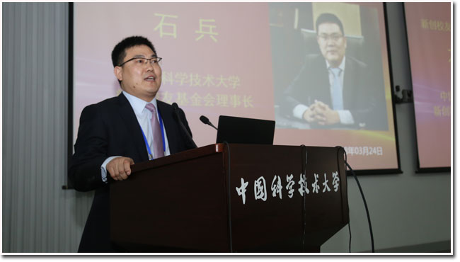 作为长期支持郭沫若奖学金项目的中国科大新创校友基金会代表,新创校友基金会理事长石兵在致辞中回顾了历届郭沫若奖学金获奖者的成就,表达了对获奖同学的祝贺。他表示,科大对人才培养十分重视,多年来人文关怀方面做出许多努力,希望各个中学继续将有探索精神、有天分的学生输送到这里来。他还介绍了自己加入新创校友基金会的初衷,表示自己在科大读书时曾受到科大的善待,现在也希望尽自己绵薄之力为学校做出应有贡献。