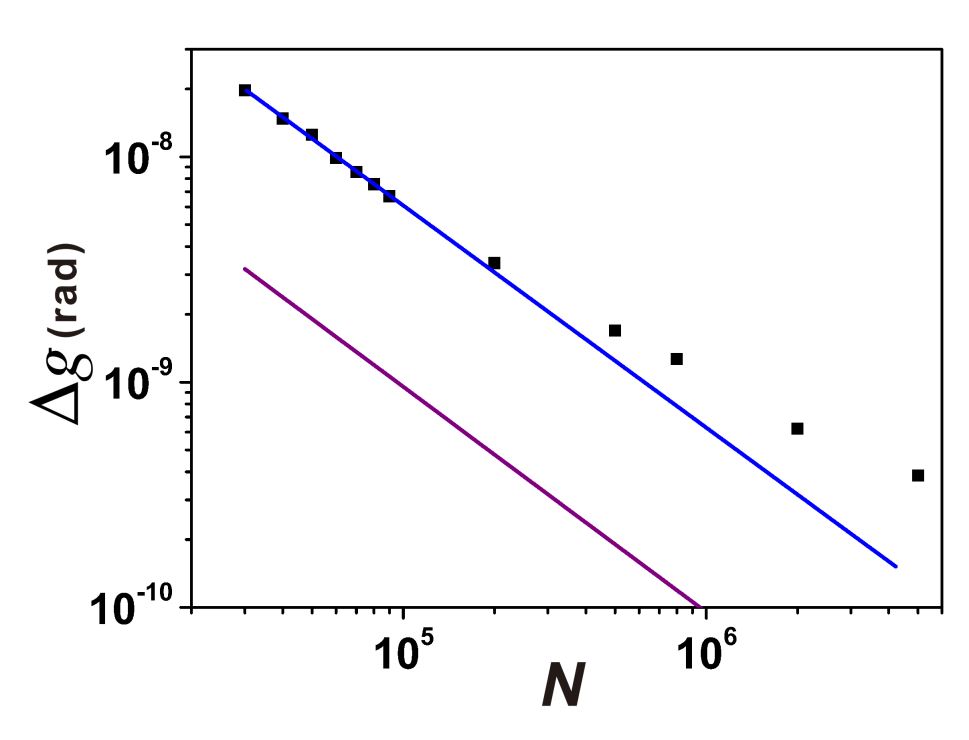 图2)实验结果。在光子数小于十万时测量精度反比于光子数,达到海森堡极限。