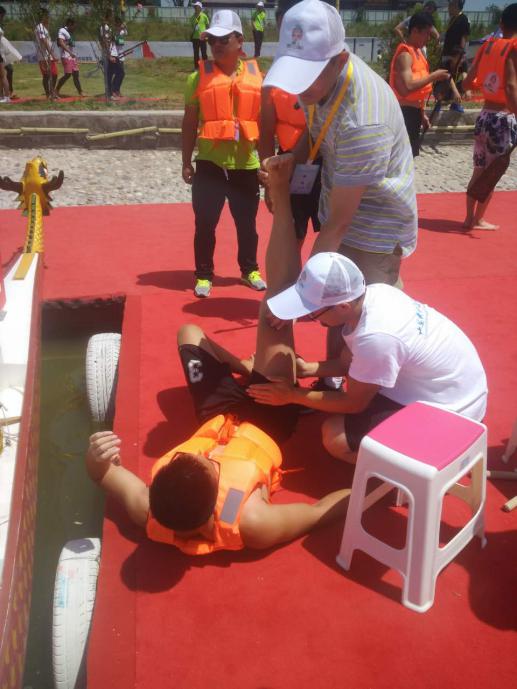 下午200米直道竞速比赛,中国科大龙舟队与多伦多大学龙舟队、菲律宾德拉萨大学龙舟队同组。发令枪响后科大龙舟队起航的优势依然明显,并以小组第一冲过终点。由于上午比其他学校多划了一趟500米,不少队员在下午第一场比赛后出现腿部抽筋的现象,我们的领桨队员韩书雅也腰部拉伤。队员们疲惫显而易见的,队里弥漫着莫名的压力,但成绩公布后,依然以54’’95的成绩领先所有队伍。