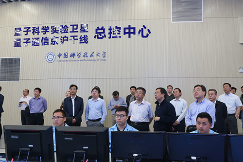 陈宝生一行参观了量子通信实验卫星总控中心和量子通信骨干网“京沪干线”总控中心。潘建伟就量子通信基础研究、科研进展、产业发展和量子科学实验卫星、量子京沪干线工作进展情况及在金融等领域的应用进行了介绍。