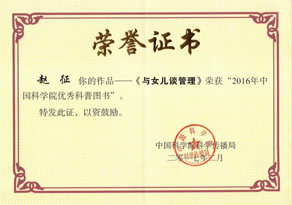 此外,中国科大管理学院赵征老师《与女儿谈管理》获“2016年中国科学院优秀科普图书”;合肥微尺度物质科学国家实验室张文卓老师在院官方科普微信号“科学大院”上发表的作品《独家揭秘:量子通信如何做到“绝对安全”?》入选“科学大院年度优秀作品”。