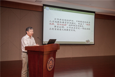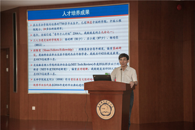 少年班学院党总支书记、副院长尹民作了《人才代出 创作当少年》的汇报,介绍了少年班的建设发展历程、培养成果、教育理念,以及学生自由选课、自选专业、自选导师、自主学习、自主研究等教育特色。