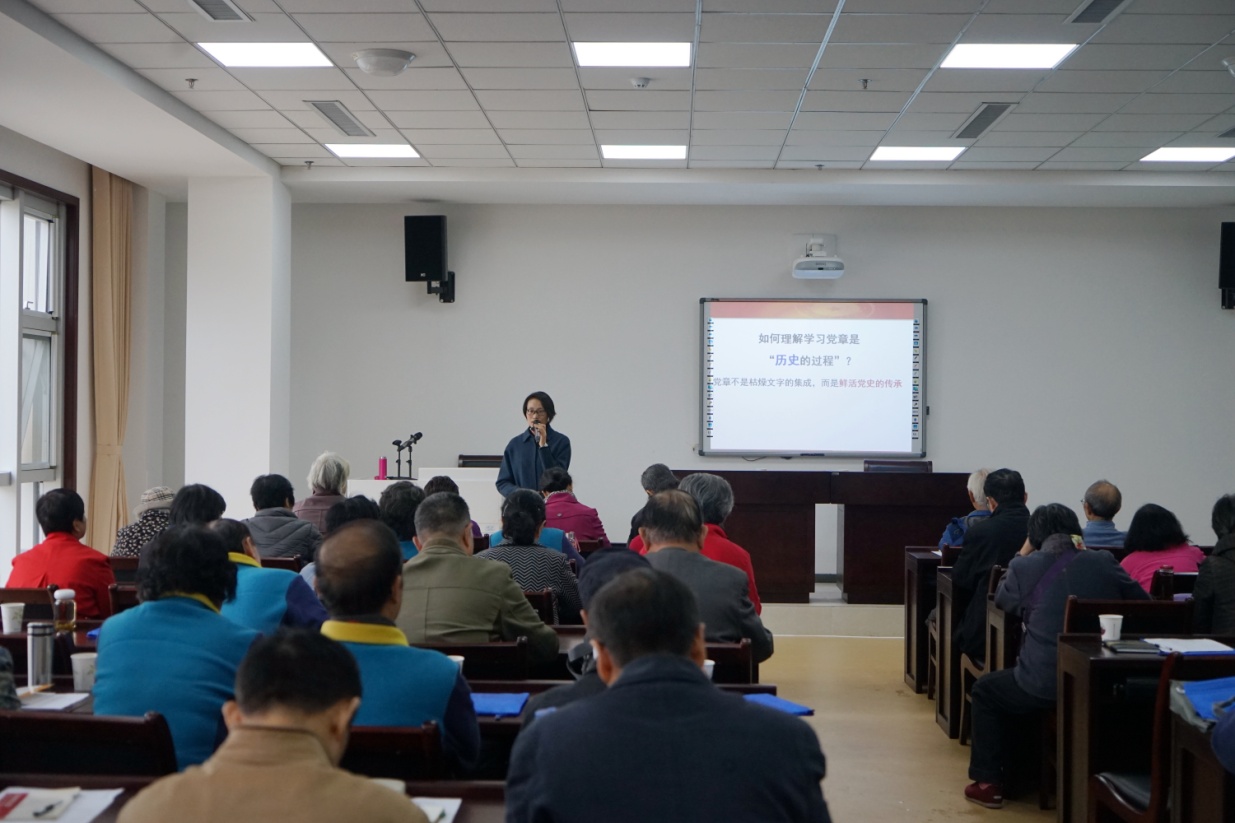 随后,安徽省委党校吴梅芳教授用两个小时的时间为大家上了一堂生动的党课。她以党章背后的故事为切入点,声情并茂地介绍了从党的“一大”到“十九大”党章的建设发展历程。吴教授详细介绍了十九大党章修正的主要特点和原则,分析了党章的体例和逻辑结构,着重阐述了十九大党章的修改内容及深刻内涵,主题鲜明,条分缕析,详细缜密。她指出,党章是党的总章程,对加强党的领导和建设具有根本性规范和指导作用。学习党章既是“历史的过程”,也是“立体的过程”。党章不是枯燥的文字,而是鲜活党史的传承,浓缩了党的历史经验和与时俱进的理论品质,字字珠玑,章章重要。在场的老同志们被如此生动的党课牢牢吸引,表示收获颇多。