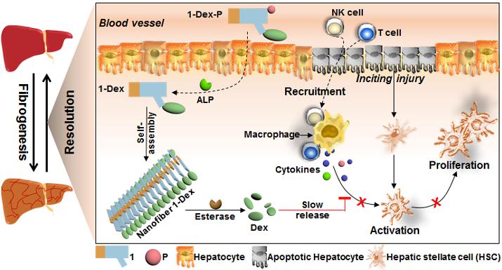 多种慢性肝脏疾病会进一步发展成肝纤维化,若不对其进行及时干预,则会进一步恶化为肝硬化甚至肝癌。抗炎疗法是目前治疗肝纤维化的标准方法之一,但是目前依然缺少能够有效控制抗炎药物(如地塞米松,Dex)自组装或者缓慢释放的智能疗法。梁高林教授课题组合理设计了一种化学结构式为1-Dex-P的成胶因子前体,同时提出了一种新的串联酶控自组装和缓慢释放地塞米松的策略(见下图)。采用这种策略,他们与廉哲雄教授课题组紧密合作,发现前体药物1-Dex-P较游离地塞米松在体内外实验中均展现出了更强的抗肝脏纤维化效应。体外酶切和细胞实验证明,1-Dex-P首先被碱性磷酸酶(ALP)去磷酸化而转变成成胶因子1-Dex,并自组装形成纳米纤维1-Dex(Nanofiber 1-Dex)。该纤维随后能被酯酶水解,在缓慢释放出地塞米松的同时,转变成一种新的纳米纤维1(Nanofiber 1)。动物实验证明,生物兼容的1-Dex-P较地塞米松药物本身显示出更强的抗肝脏纤维化的效果。需要指出的是,该智能串联酶控策略可被广泛用于设计更多更加精致的药物输送系统,从而在未来的临床上有效增强药物的治疗效果。