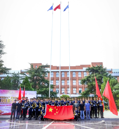升旗仪式结束后,同学们在飘扬的五星红旗下合影留念。
