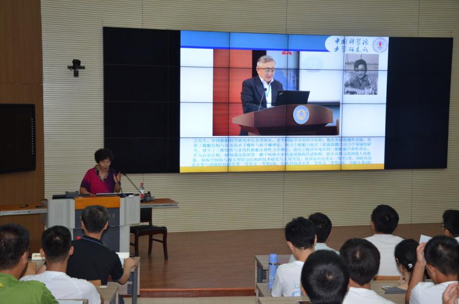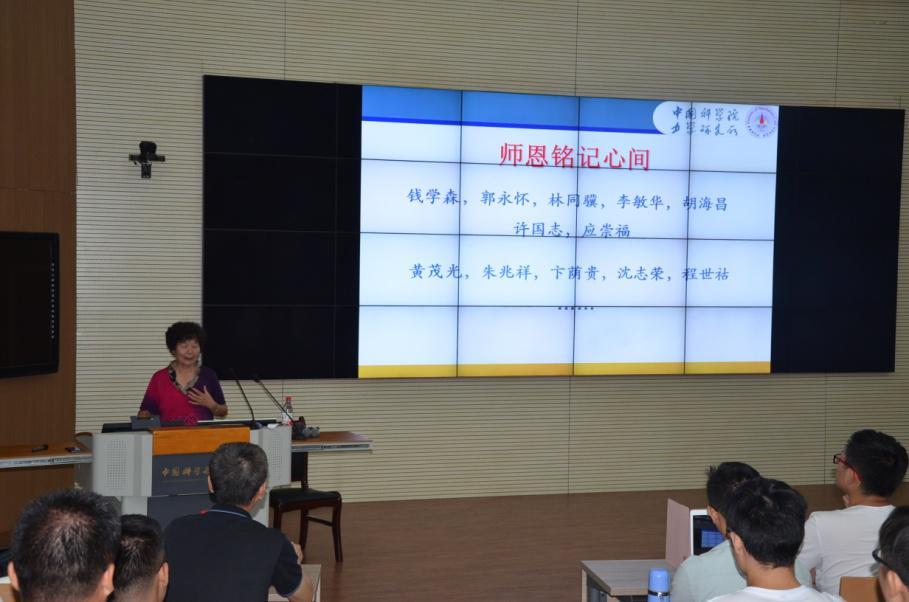 报告会伊始,王柏懿介绍了工程科学学院的历史变迁和科大创建之初老一辈科学家钱学森、郭永怀为力学与力学工程系(5907)本科生亲自制定的教学计划情况。她回顾了自己在科大求学的经历,并向大家展示了59级校友吴有生院士、杜善义院士、科技将军沈庆教授求学时的照片和精彩的科技人生。王柏懿骄傲地说:“科大是千生一院士,而我们‘5907’是‘百生两院士’和一位科技将军”。她鼓励大家说:“这些院士在读书的时候和大家一样都是普通的大学生,只要大家肯努力肯付出,将来一样能做出伟大的事”。