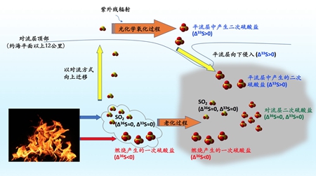 研究人员通过系统地测定华南气溶胶的硫酸盐、大气中的二氧化硫以及代表性煤的稳定硫同位素,发现了气溶胶硫酸盐33S和36S的异常组成与大气中二氧化硫和煤的同位素组成不同。放射性35S分析结果显示,33S的异常组成与气团高度的变化密切相关,这说明二次硫酸盐形成过程中硫循环经历了在平流层的光化学反应然后沉降到对流层和地表。研究的另一个重要发现是36S异常与33S异常不存在相关性,但36S异常与硫氧化率及多种生物质燃烧示踪物(左旋葡聚糖、甘露聚糖、钾离子)的丰度均呈现非常好的相关性。研究结论是,在东亚及北美地区广泛观测到的气溶胶硫酸盐36S异常主要是由化石燃料或生物质燃烧直接生成的一次硫酸盐气溶胶造成的。该研究证明了硫同位素是追踪不同成因雾霾硫酸盐来源和形成机制的有力手段(如图):
