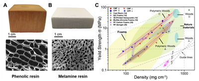 图2. 仿生人工木材的照片、结构和力学性能。(A)酚醛树脂基人工木材与微观结构;
