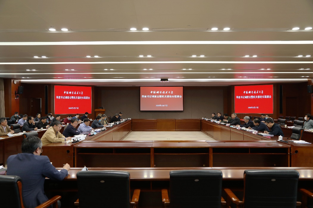 4月17日上午,学校召开2020年第二季度书记调度会暨机关部处长联席会,校党委书记舒歌群、校领导朱长飞、蒋一、王晓平、毕金初、何淳宽、褚家如出席会议,各院级党组织书记、机关各部处室主要负责人参加会议。会议由党委常委、副校长、机关党委书记朱长飞主持。