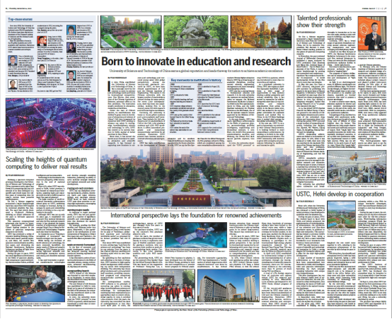 12月24日,《中国日报》(China Daily)第6版、7版整版报道了中国科大南迁五十周年历史及其产生的丰硕成果。两版共有5篇专题文章,分别是“USTC: ‘The cradle of scientists’ in China”(中国科大:中国“科学家的摇篮”)、“Global perspective lays foundation for fruits”(全球视野奠定坚实基础)、“Scaling the peak of sciences to deliver tangible results”(勇攀科学高峰、取得丰硕成果)、“Attracting best talents key to success”(吸引优秀人才是成功的关键)、“USTC, Hefei develop hand in hand”(中国科大与合肥携手发展)。
