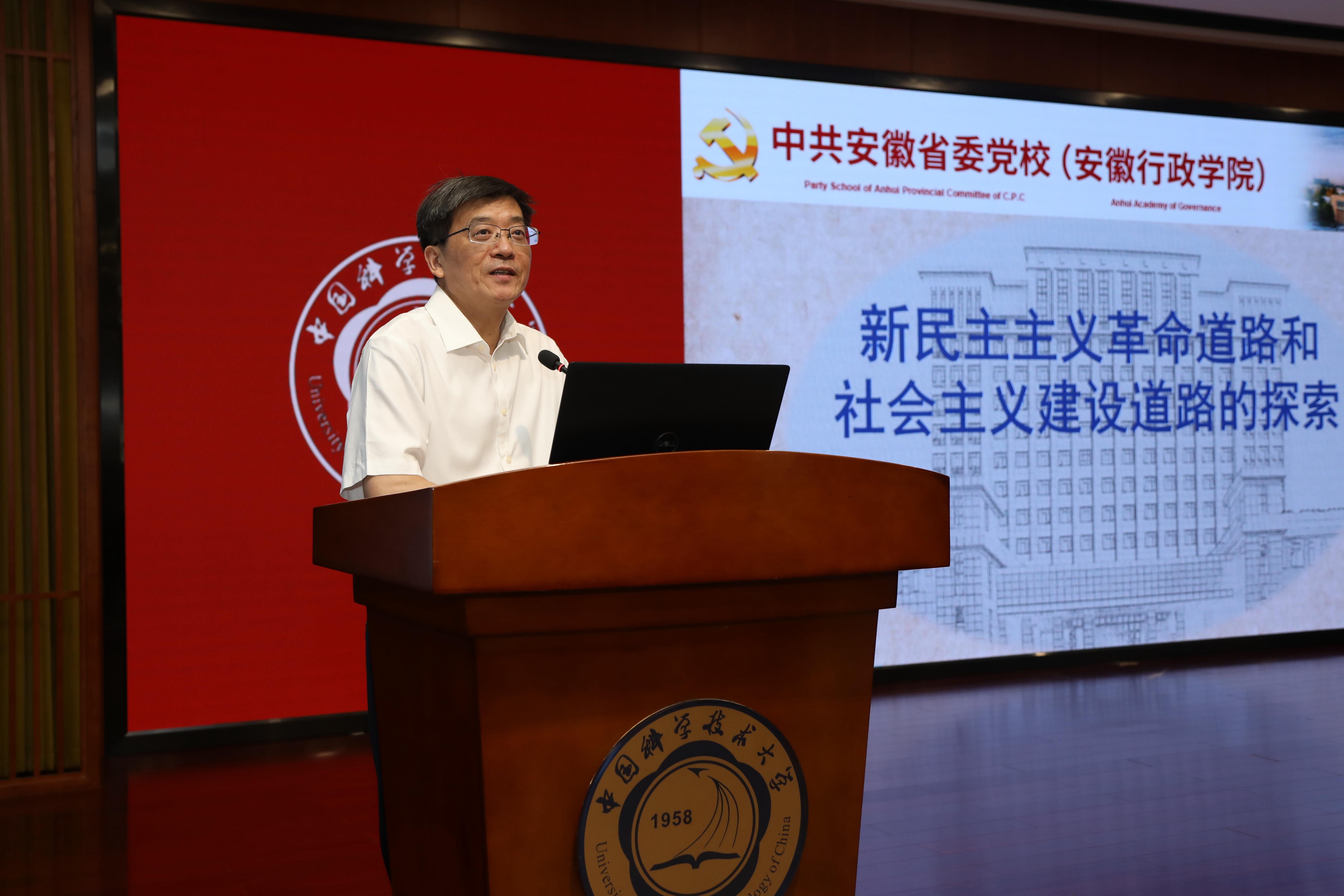 胡忠明以《新民主主义革命道路和社会主义建设道路的探索》为题,以新民主主义革命道路的初步探索和形成,以及社会主义道路探索的成就、失误和基本认识为主线,从新民主主义革命道路的开辟和社会主义道路的探索、几点体会三方面进行阐述,旁征博引、图文并茂、史论结合、引人入胜。