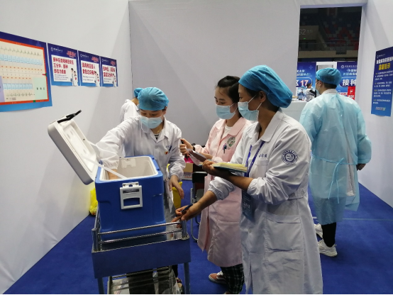护理部的查青霜护士长也是一位老党员,每天她一来到接种点,就会穿上工作服,一刻不停的忙碌起来,有时她推着物资分发车到各个接种区发放接种物资,有时她在接种区给师生接种疫苗,有时她又推着小车为现场的工作人员发放牛奶补充体力,一天的工作快结束了,查护士长又要拿着冷藏箱到各个接种点统计回收没有用完的疫苗。