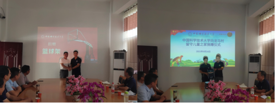 在龙马村党群服务中心会议室内,科研部副部长薛永泉、团委副书记赵林代表学校分别向张畈小学和龙马村留守儿童之家捐赠了学习用品和体育器材。张畈小学校长胡晓春、龙马村党支部书记汪光辉接受捐赠。