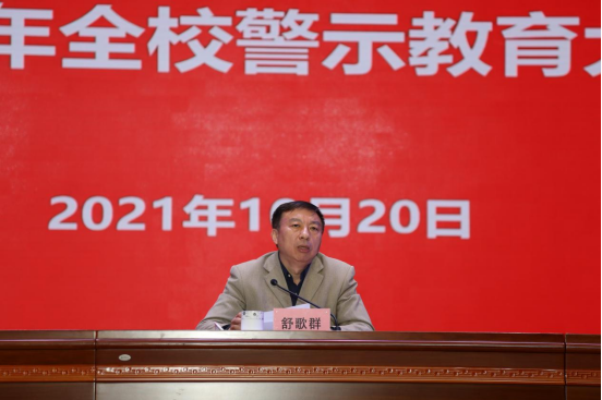 舒歌群就贯彻落实习近平总书记关于全面从严治党的系列重要指示精神、“七一”重要讲话精神,推进落实中央巡视整改工作,进一步加强党风廉政建设和反腐败斗争进行了再部署、再动员。他指出,会上通报的违规违纪违法和师德失范典型案例都是身边人身边事,无不警示我们,高校并非净土。全面从严治党,高校不能例外,“象牙塔”更需要风清气正。舒歌群要求广大党员干部、师生员工要把党的政治建设摆在首位,永葆对党忠诚的政治本色;要切实履行党风廉政建设的主体责任,抓好“牛鼻子”、种好“责任田”;要充分发挥巡视巡察利剑作用,高质量完成中央巡视整改工作;要深入开展党史学习教育,大力弘扬老一辈科学家精神,加强师德师风建设,构建良好教育生态。