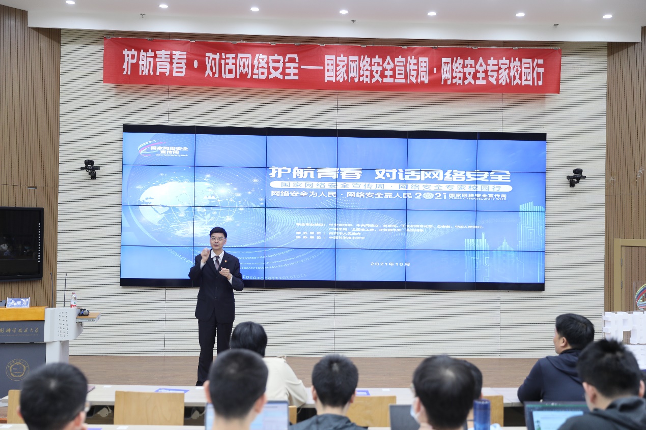 校党政办、网信办副主任彭慧在致辞中表示,习近平总书记指出“没有网络安全,就没有国家安全”,此次网络安全专家校园行主题活动对网络安全知识宣传和网络安全技能科普具有积极意义。她以学校近期发生的网络安全诈骗案例举例,警示大家提高网络安全的意识,增强维护网络安全的能力。