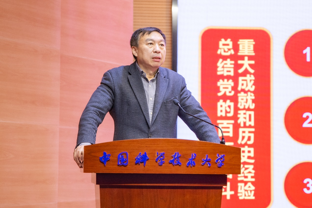 12月22日下午,中国科学技术大学学习贯彻党的十九届六中全会精神宣讲团团长、校党委书记舒歌群在水上报告厅为物理学院和化学与材料科学学院师生作党的十九届六中全会精神学习宣讲报告。物理学院、化学与材料科学学院党员同志、师生代表共同聆听了报告,宣讲会由化学与材料科学学院党委书记、副院长闫立峰主持。