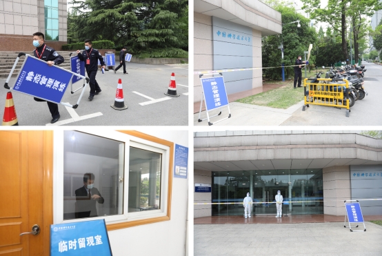 14:05,封控区周边警示带和提醒标识设置完毕,出入口设岗,严禁人员及车辆进出封控区;告知封控楼栋所有人员原地待命,主动做好个人防护,配合落实核酸检测和健康监测等措施。校医院在封控楼栋设置临时留观室,指导“阳性感染者”立即进入临时留观室,等待隔离转运。物业公司紧急调度工作人员,穿戴防护用具,接管封控楼栋服务保障工作。