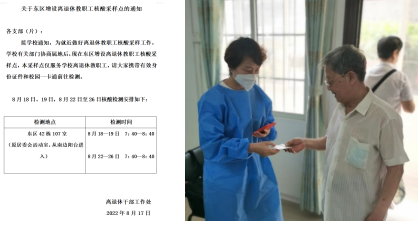 疫情防控常态化下,为方便东区离退休教职工的核酸检测,在校领导的关心支持下,学校相关部门经过协调,在东校区内就近设立了临时核酸检测点,离退休老同志可凭借相关证件参加检测,极大方便了老同志的日常生活。