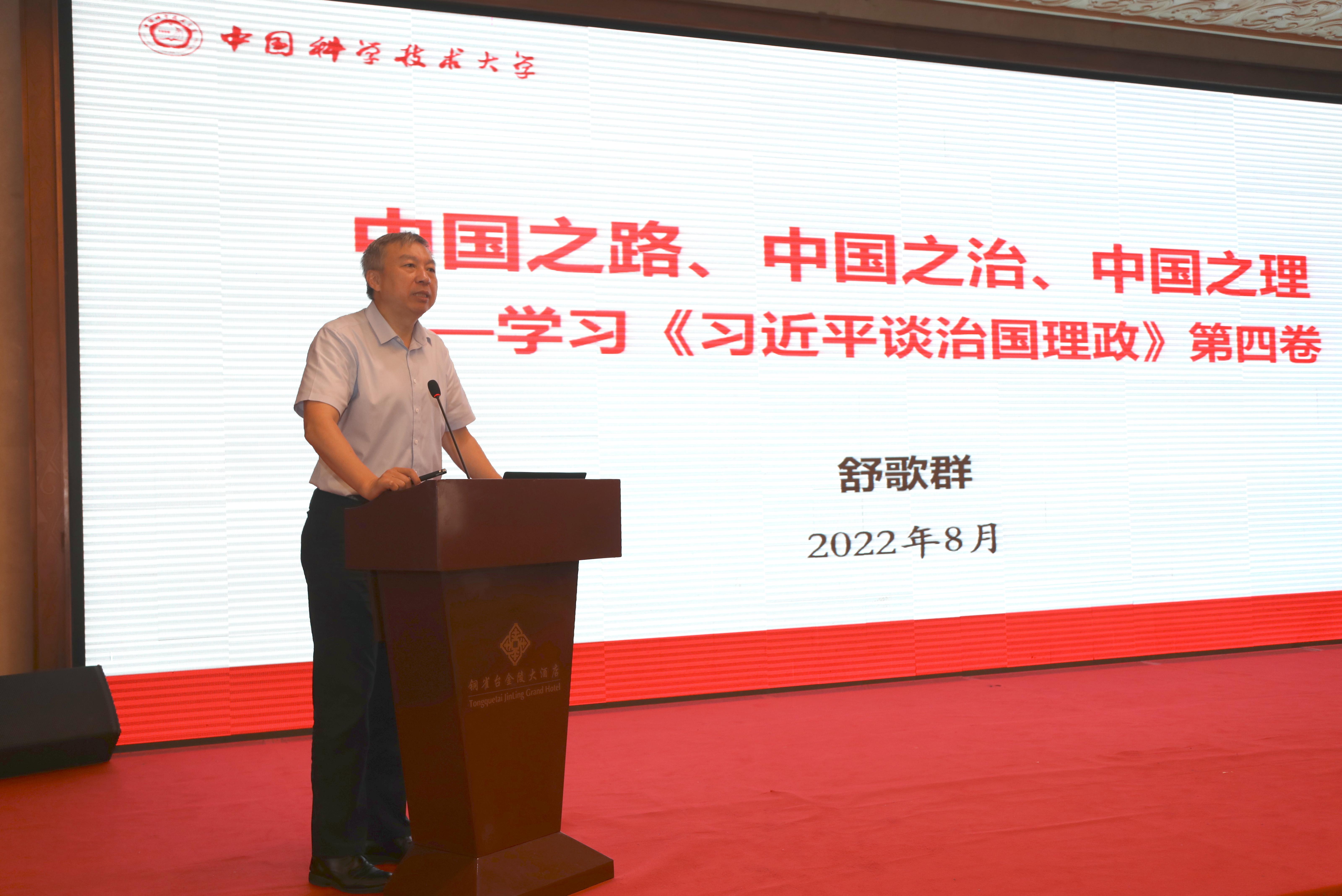8月25日上午,中国科学技术大学召开党委理论学习中心组集中学习(扩大)会。校党委书记舒歌群主持会议并作辅导报告。校长包信和及其他校领导,学院、重点科研机构、附属医院、直属单位党政主要负责人,校长特别助理,机关部门主要负责人参加学习会。