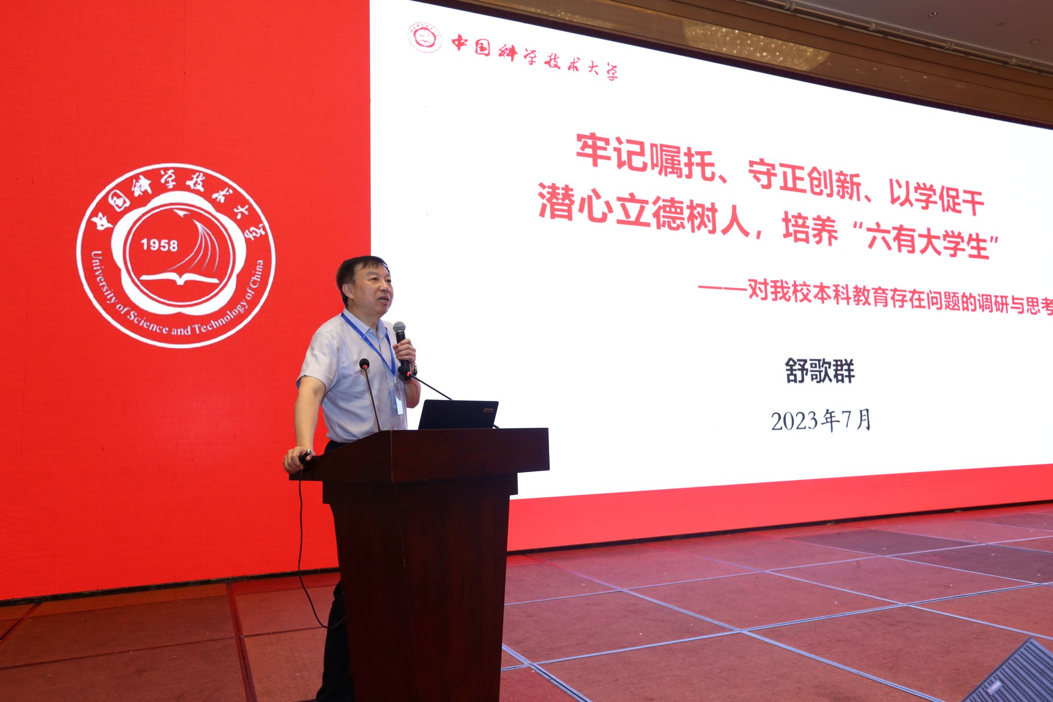 读书班期间,舒歌群作题为《牢记嘱托、守正创新、以学促干 潜心立德树人,培养“六有大学生”》的主题报告。舒歌群在报告中指出,培养高水平拔尖创新人才是中国科大的建校初心和职责使命,也是中国科大在新时期建设中国特色、科大风格的世界一流大学必须始终锚定的办学宗旨。要坚持用习近平新时代中国特色社会主义思想的世界观和方法论指导工作,以主题教育为契机,学思想、强党性、重实践、建新功,牢记嘱托、守正创新、以学促干,坚持科教融合育人的优良传统,培养学生国际化视野,持续优化课程设置,落实全员全过程全方位育人要求,当好教育强国建设的高等教育龙头,在主题教育中做好为党育人、为国育才的时代答卷。