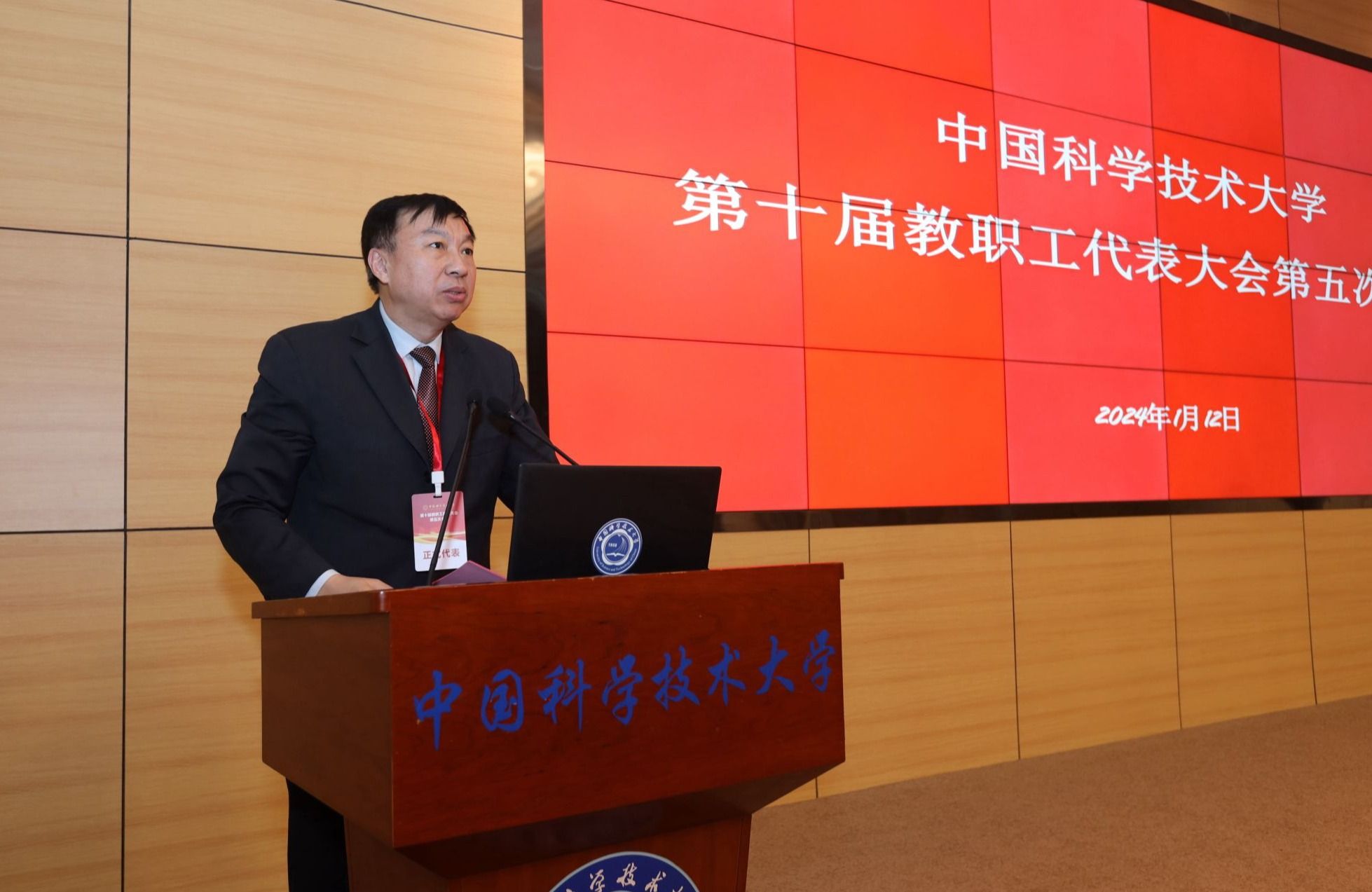 包信和作题为《策马扬帆争创佳绩 启程奔浪勇开新局——奋力建设中国特色、科大风格的世界一流大学》的行政工作报告。他指出,在中国科学院、教育部和安徽省委省政府的坚强领导下,学校领导班子坚持以习近平新时代中国特色社会主义思想为指导,深入学习宣传贯彻党的二十大精神,将习近平总书记关于中国科大系列重要指示精神贯穿办学治校各环节,团结带领全校广大师生员工,潜心立德树人,执着攻关创新,在基础性、战略性工作上狠下功夫,奋力建设中国特色、科大风格的世界一流大学,不断推进学校事业发展取得新进展。