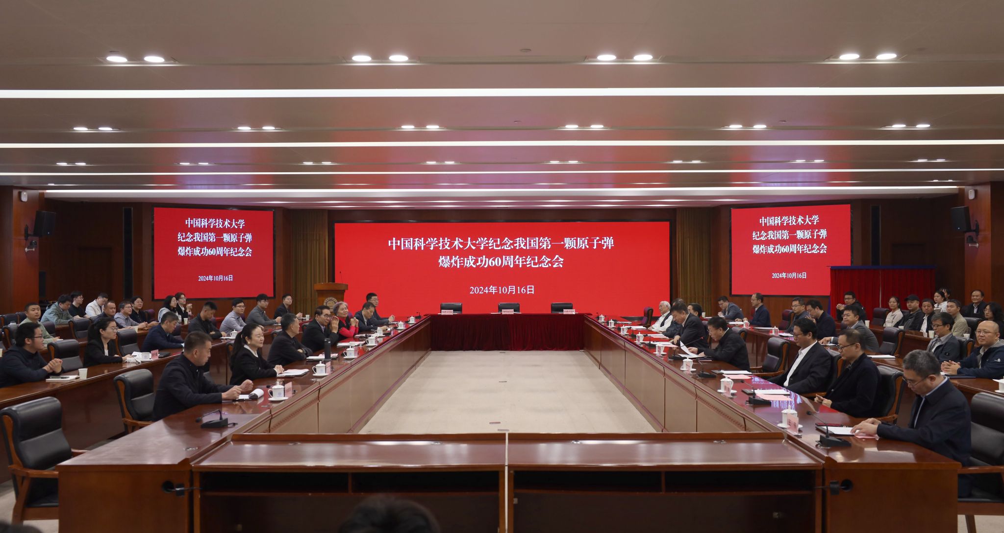 10月16日上午,学校在东活五楼报告厅隆重举行纪念我国第一颗原子弹爆炸成功60周年纪念会。中国科大名誉校长、中国科学院原院长白春礼院士,严济慈先生孙女严慧英女士,中国科学院力学研究所所长罗喜胜,两弹一星历史研究会副理事长王定放少将,中国科大党委书记舒歌群、原校长包信和,青海两弹一星干部学院副院长李恒,四川两弹一星干部学院常务副院长刘涛出席会议。校领导蒋一、邓建松、李峰、王伟,机关各部门主要负责人,在校师生代表参会。