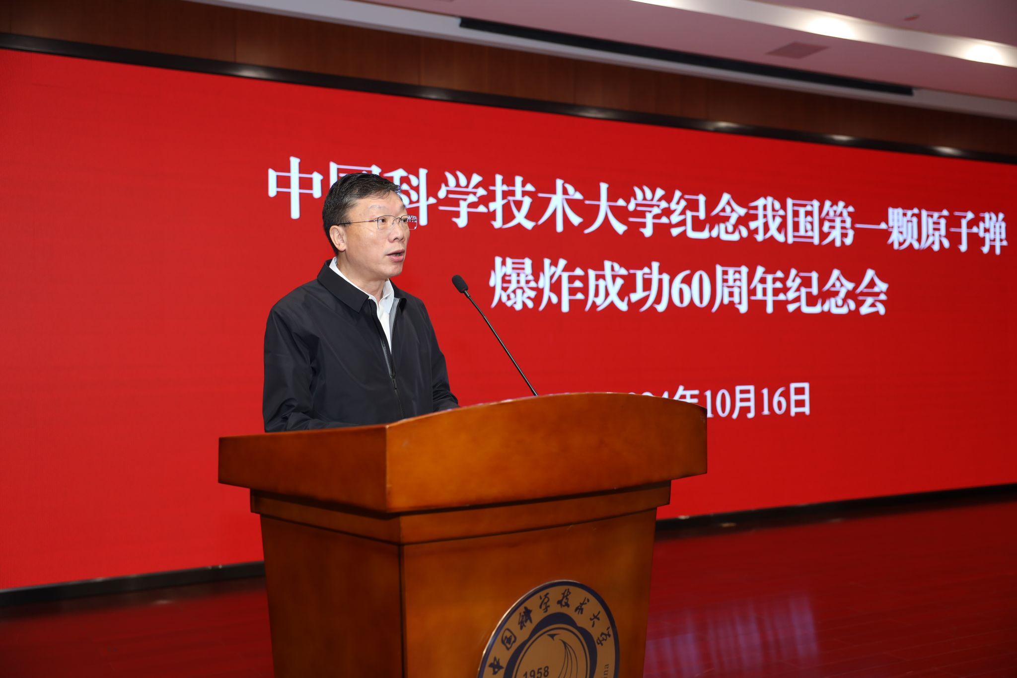 白春礼指出,60年前的今天,我国第一颗原子弹爆炸成功,中国自此打破了超级大国的核垄断和核讹诈,迈入了大国行列。中国科大是党为“两弹一星”事业亲手创办的一所红色大学,66年来,在中国科学院的领导下,学校秉承“红专并进、理实交融”校训,将自身发展融入国家发展大局,为国家科技事业的发展输送了大量中坚力量。希望中国科大全体师生牢记习近平总书记殷殷嘱托,厚植热爱祖国、无私奉献的家国情怀,锻造自力更生、艰苦奋斗的民族精魂,锤炼大力协同、勇于登攀的科学品格,心有大我、至诚报国,为我国加快建设教育强国、科技强国、人才强国,为全面建设社会主义现代化国家贡献科大力量。