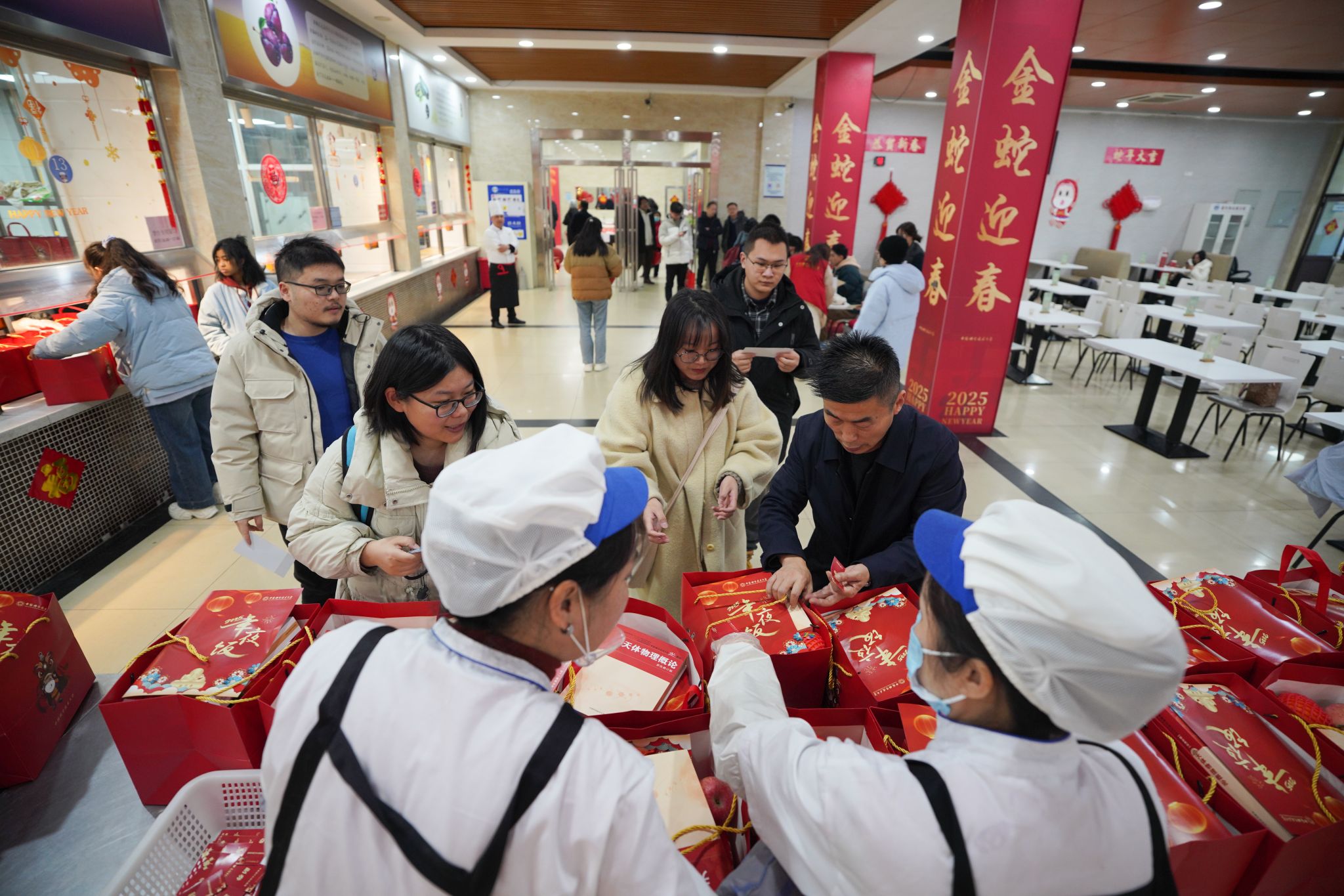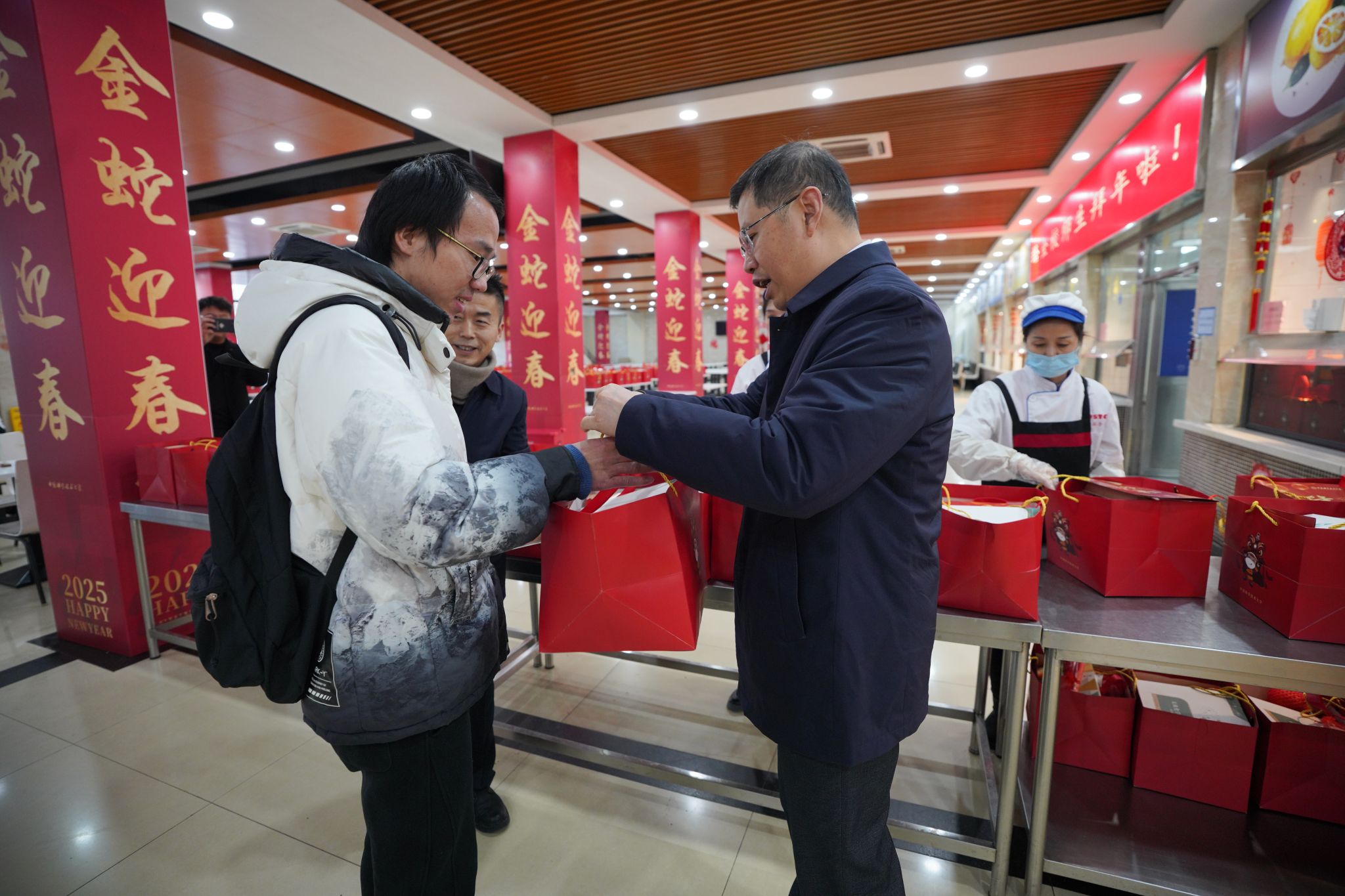 下午四点,邓建松和李峰为现场学生送上年夜饭大礼包并亲切交谈,详细了解他们留校期间的学习生活情况,代表学校向大家致以蛇年新春祝福,表示学校将继续为留校学生的学习生活提供保障,并努力营造喜庆温馨的新春氛围,同时鼓励同学们做好假期规划,提升自我。