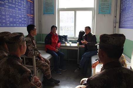 党委人武部副部长、学生处副处长聂磊与连队领导和郭鹏波、黄蒙奇同学进行了座谈。郭鹏波、黄蒙奇同学汇报了自己在部队服役的心得体会与收获,连长李国禄介绍了郭鹏波、黄蒙奇在部队的学习和工作情况,对郭鹏波、黄蒙奇在部队的表现给予了充分肯定,并感谢学校为部队输送了优质兵员。