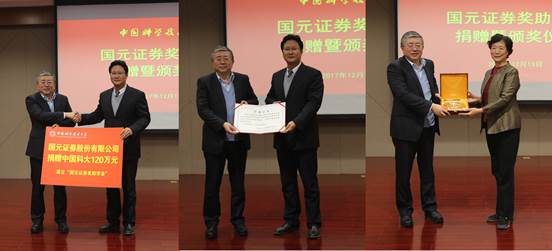 12月13日下午, 学校在东区师生活动中心五楼报告厅举办2017年度国元证券奖助学金捐赠暨颁奖仪式。国元证券股份有限公司党委书记、董事长蔡咏一行四人,校党委副书记蒋一、校友总会副会长鹿明、学生工作部(处)学生资助中心有关老师,以及获得本次奖助学金的同学参加了颁奖仪式。仪式由校友总会副会长、教育基金会秘书长郭胜利主持。