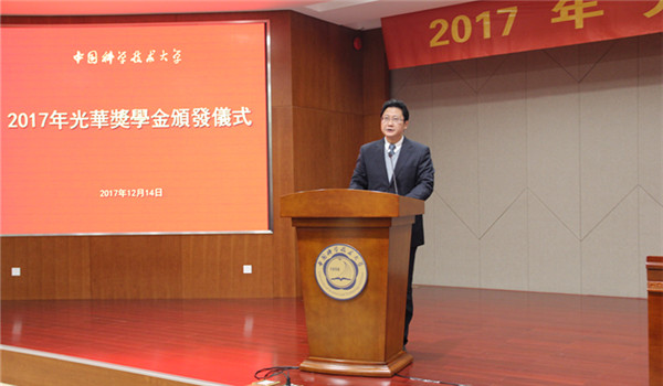 蒋一代表学校对光华教育基金长期以来对祖国教育事业的支持表示衷心感谢。他表示,近年来中国科大在人才培养和创新领域取得了骄人成绩,为我国教育科研事业做出了重大贡献。明年是我校建校六十周年,在新时期,中国科大将传承“红专并进、理实交融”的校训精神,弘扬科教报国传统,加快建成具有中国特色的世界一流大学。希望同学们以获得光华奖学金为动力,秉承科大精神奋发努力,牢记责任,以“六有”大学生的标准要求自己,为发扬光大中华文化贡献自己的力量。