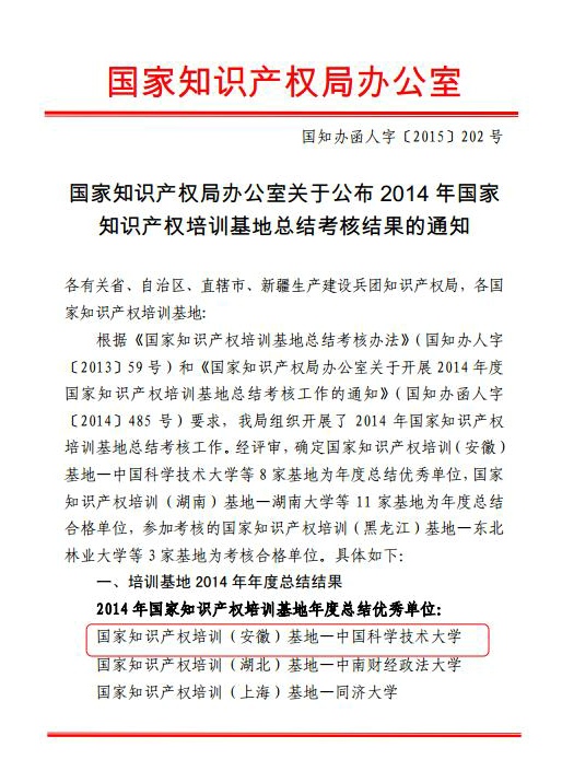 4月27日,国家知识产权局办公室国知办函人字[2015]202号文件正式公布了该办对全国22家国家知识产权培训基地的2014年度总结考核结果,设立在我校的国家知识产权培训(安徽)基地得分名列第一,被确定为2014年度总结优秀单位。自国家知识产权局对全国培训基地考核以来,设在我校的培训基地每年均被评为优秀单位。