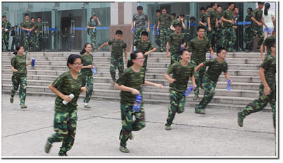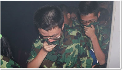 下午四点,演习活动正式开始。演习活动由点燃道具烟饼、切断照明电源、警报响起、人员有序疏散、清查现场、疏散区域集结、清点上报人数、总结点评等环节组成。参加演习的全体学生全部由礼堂安全撤离到达指定集结地点后,各营承训教官向军训团领导汇报了集结人数,对同学们进行了简单总结点评。
