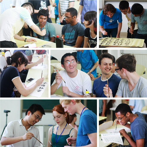 书法课上,营员们从学习如何使用毛笔开始,尝试着落笔写字。志愿者们细心地帮国外营员写出了他们的中文名字,而中国营员们也积极地为他们讲解汉字的结构、笔画等小知识。虽然结构复杂的汉字让常年书写英文的营员们着实吃了点苦头,但是经过一个多小时的练习,大家还是写出了有模有样的作品。课后,营员们兴奋地展示出自己的成果,成就感十足。