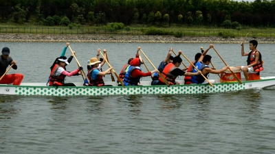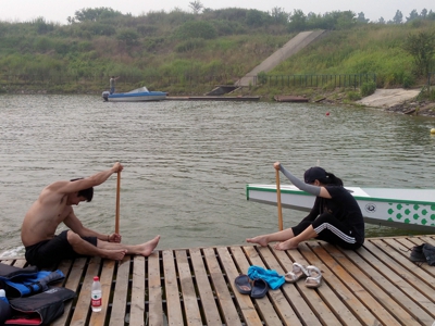 几分钟休息过后,长距离绕标赛随即鸣枪开划。与科大同时出发的是浙江大学和南京大学代表队,经过短暂而又激烈的争夺之后,科大的4号龙舟抢得先机。