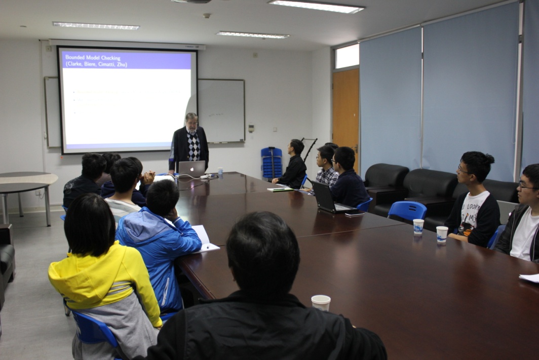10月23日上午,Clarke教授为研究中心师生带来了第二场专场讲座,题目为“Bounded Model Checking with SAT/SMT”。Clarke教授在这个讲座中重点讲述了他在模型检查方法中取得的一个重大突破——目前已在工业界广泛采用的基于SAT工具的限界模型检查方法。研究中心的师生表示通过这个内容详实的讲座学习到了模型检查最前沿的研究成果与工业应用,收获颇丰。